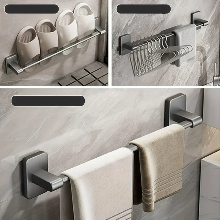Feito de liga de alumínio de alta qualidade, este suporte é a escolha ideal para ambientes úmidos como banheiros e lavabos. Ele é altamente resistente à corrosão e ao desgaste, o que garante uma longa vida útil. Além disso, suas bordas lisas evitam arranhões e danos às toalhas, proporcionando segurança e um toque de cuidado em cada detalhe.