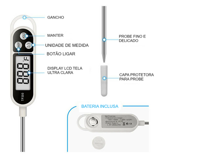 O termômetro é resistente à água? Sim, o termômetro é projetado para suportar respingos e limpeza sob água corrente.